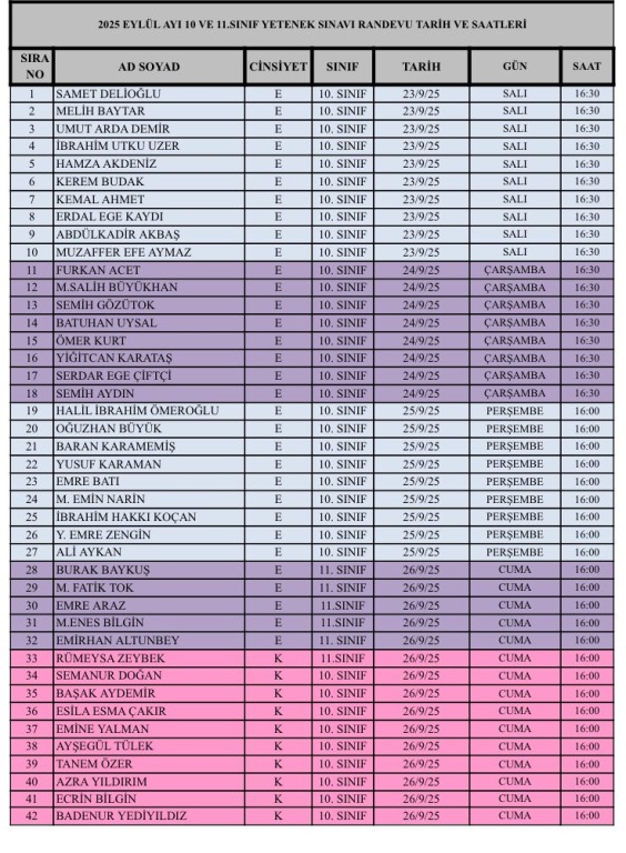 2025 EYLÜL AYI 10 ve 11.SINIF YETENEK SINAVI RANDEVU TARİH VE SAATLERİ